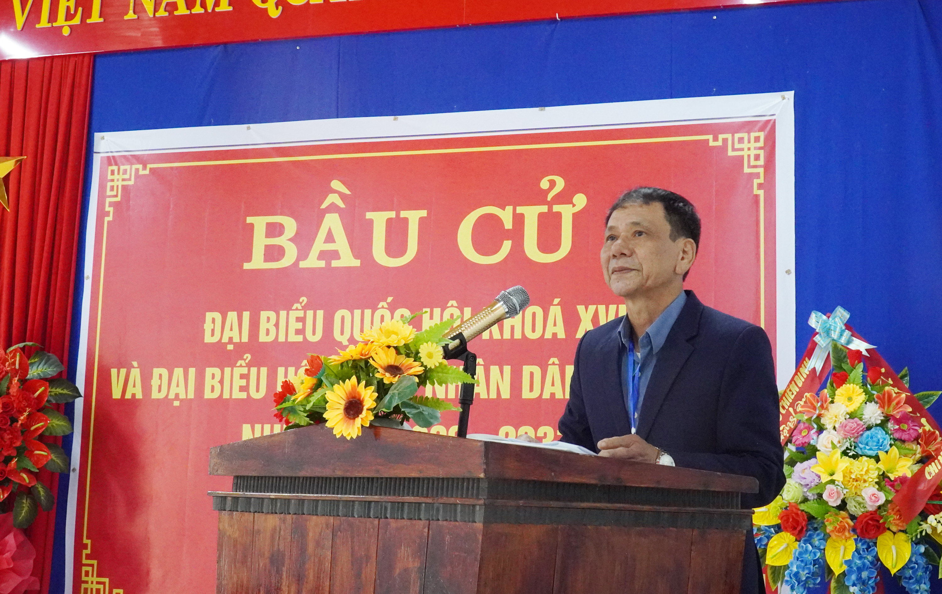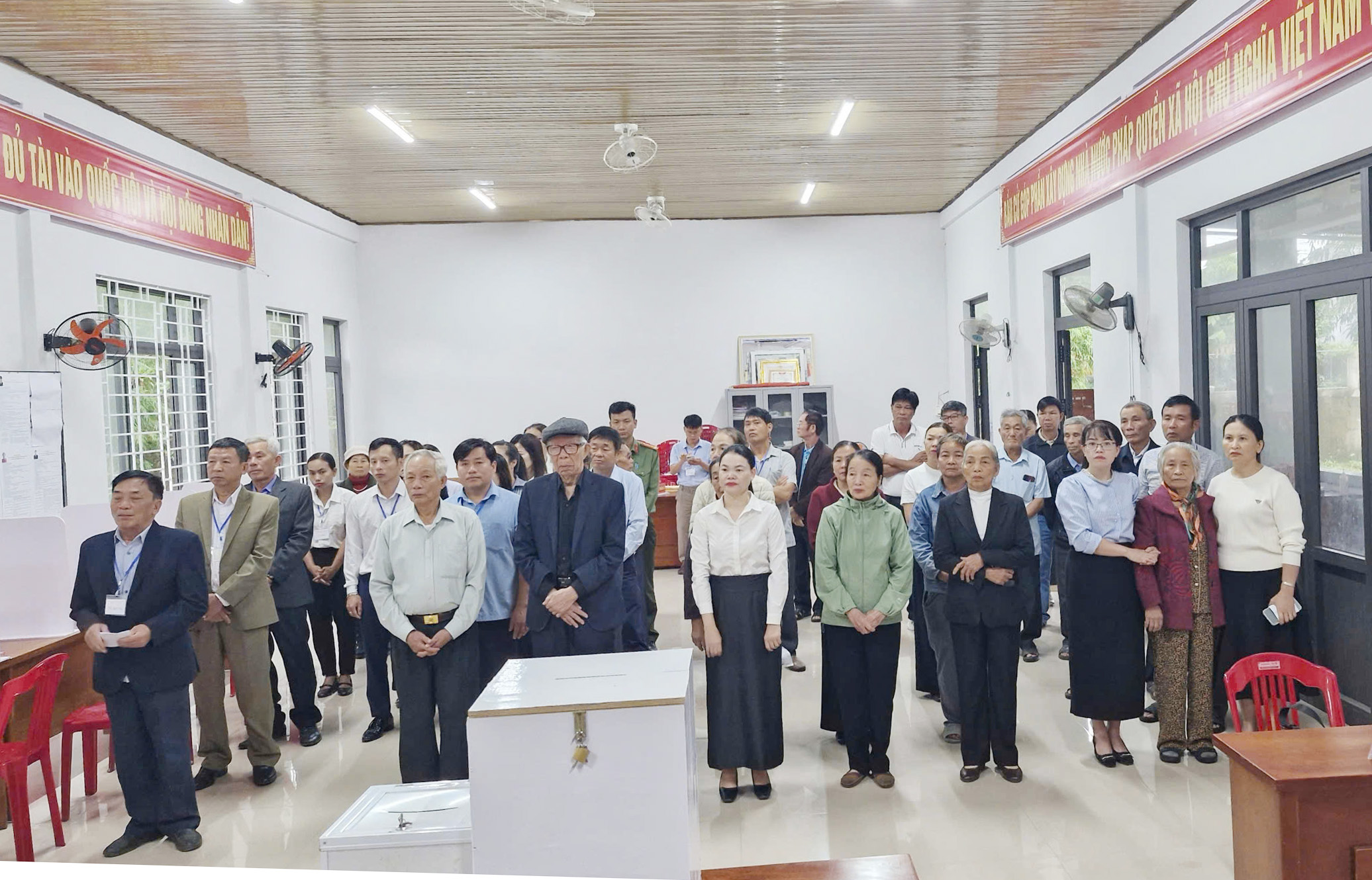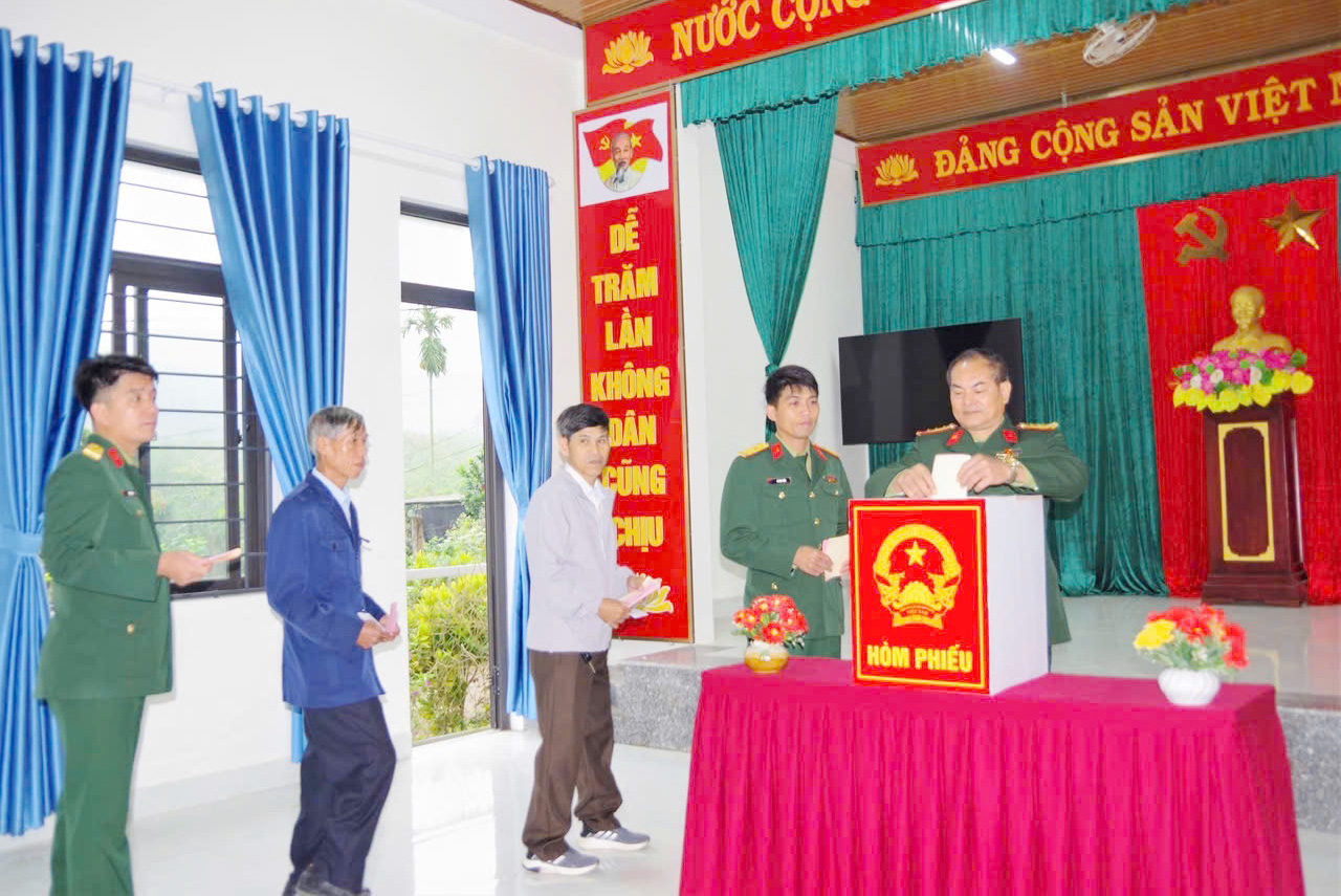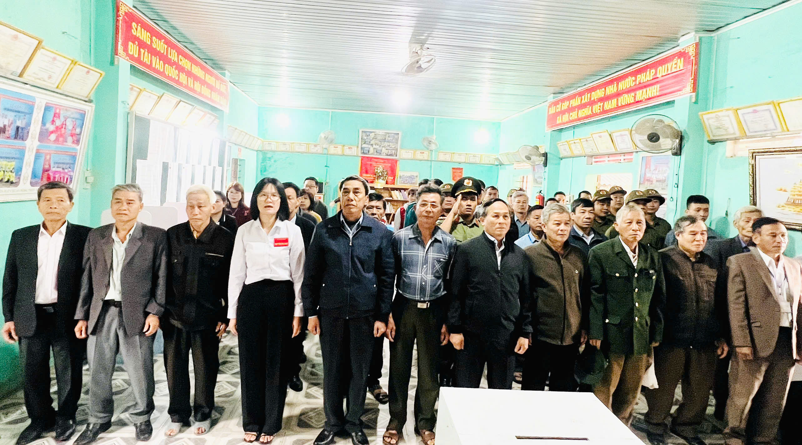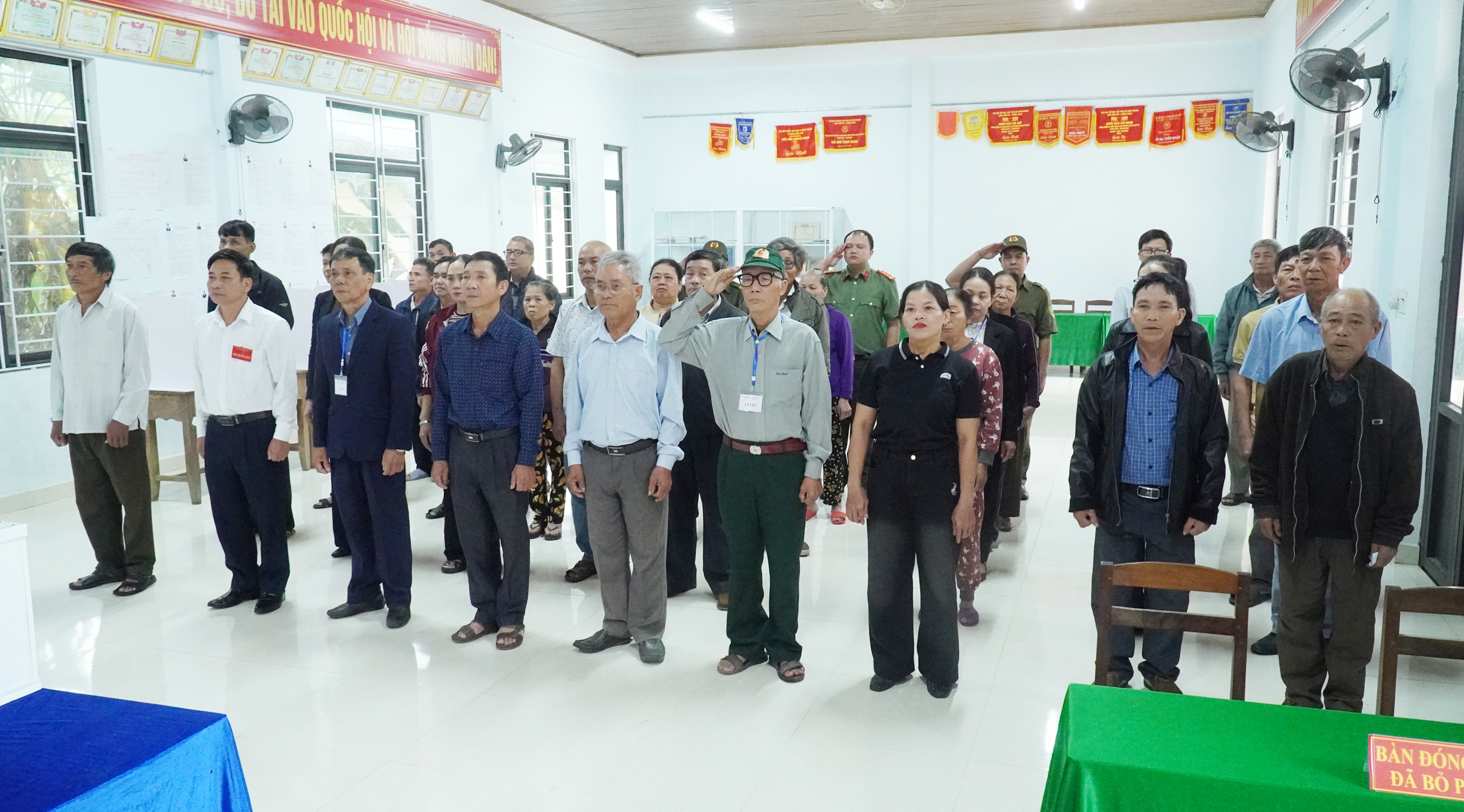 Tại buổi lễ, các đồng chí lãnh đạo tỉnh, lãnh đạo xã và cử tri đã thực hiện nghi thức chào cờ trong không khí trang trọng, thể hiện niềm tự hào và tinh thần trách nhiệm của công dân đối với sự kiện chính trị quan trọng của đất nước.