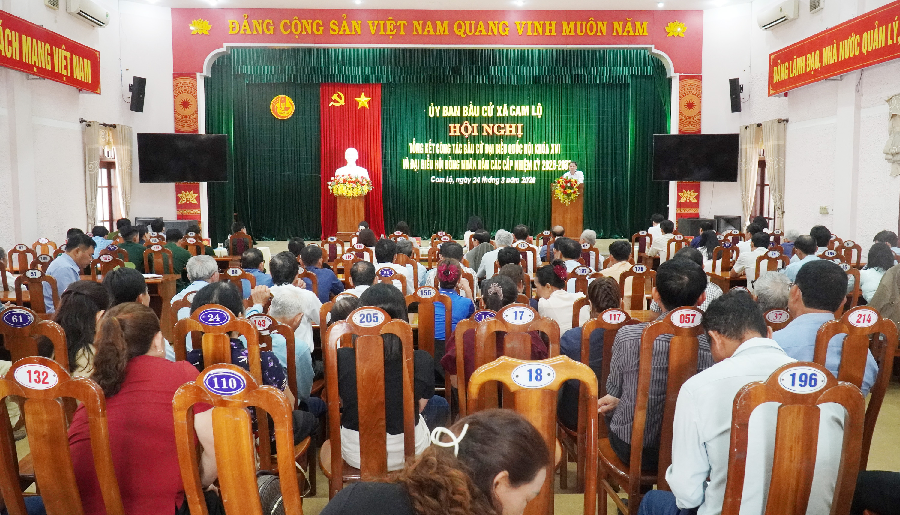 Chiều 24/3, Ủy ban bầu cử xã Cam Lộ tổ chức hội nghị tổng kết công tác bầu cử đại biểu Quốc hội khóa XVI và đại biểu HĐND các cấp nhiệm kỳ 2026-2031. Tham dự có các đồng chí: Nguyễn Thị Hoàng Oanh, Phó Bí thư Thường trực Đảng ủy xã; Nguyễn Văn Ân, Phó Bí thư Đảng ủy, Chủ tịch UBND xã; Dương Thị Thương, UVBTV Đảng ủy, Chủ tịch Ủy ban MTTQ Việt Nam xã cùng các đồng chí trong BTV Đảng ủy, Thường trực HĐND, UBND, Ủy ban MTTQ Việt Nam xã; thành viên Ban Chỉ đạo, Ủy ban bầu cử xã.