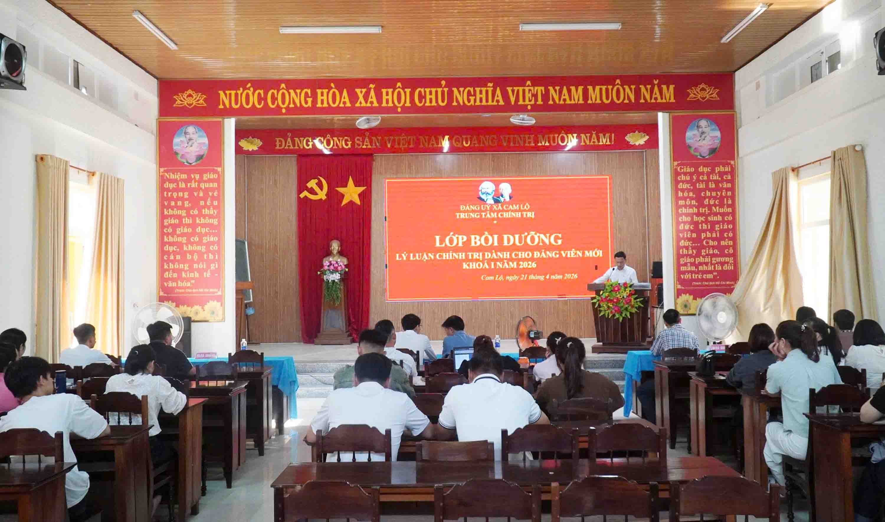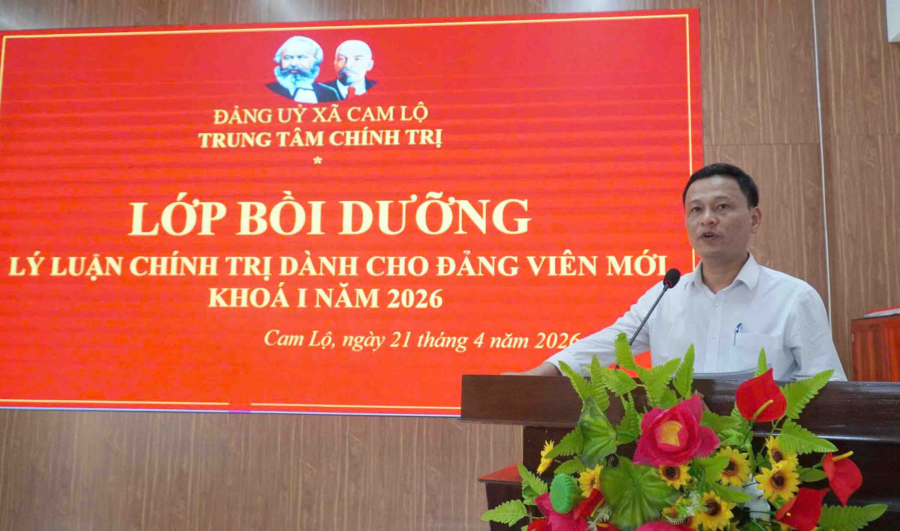 Sáng 21/4/2026, Trung tâm Chính trị xã Cam Lộ tổ chức khai giảng lớp bồi dưỡng lý luận chính trị khóa I năm 2026 dành cho đảng viên mới. Tham gia lớp học có 44 học viên đến từ các đơn vị: Đảng bộ xã Cam Lộ, xã Hiếu Giang; Đảng ủy cơ sở Trại giam Nghĩa An; Đảng ủy Công ty Xăng dầu Khu vực 2; Đảng ủy Viện Kiểm sát nhân dân Khu vực 5.
