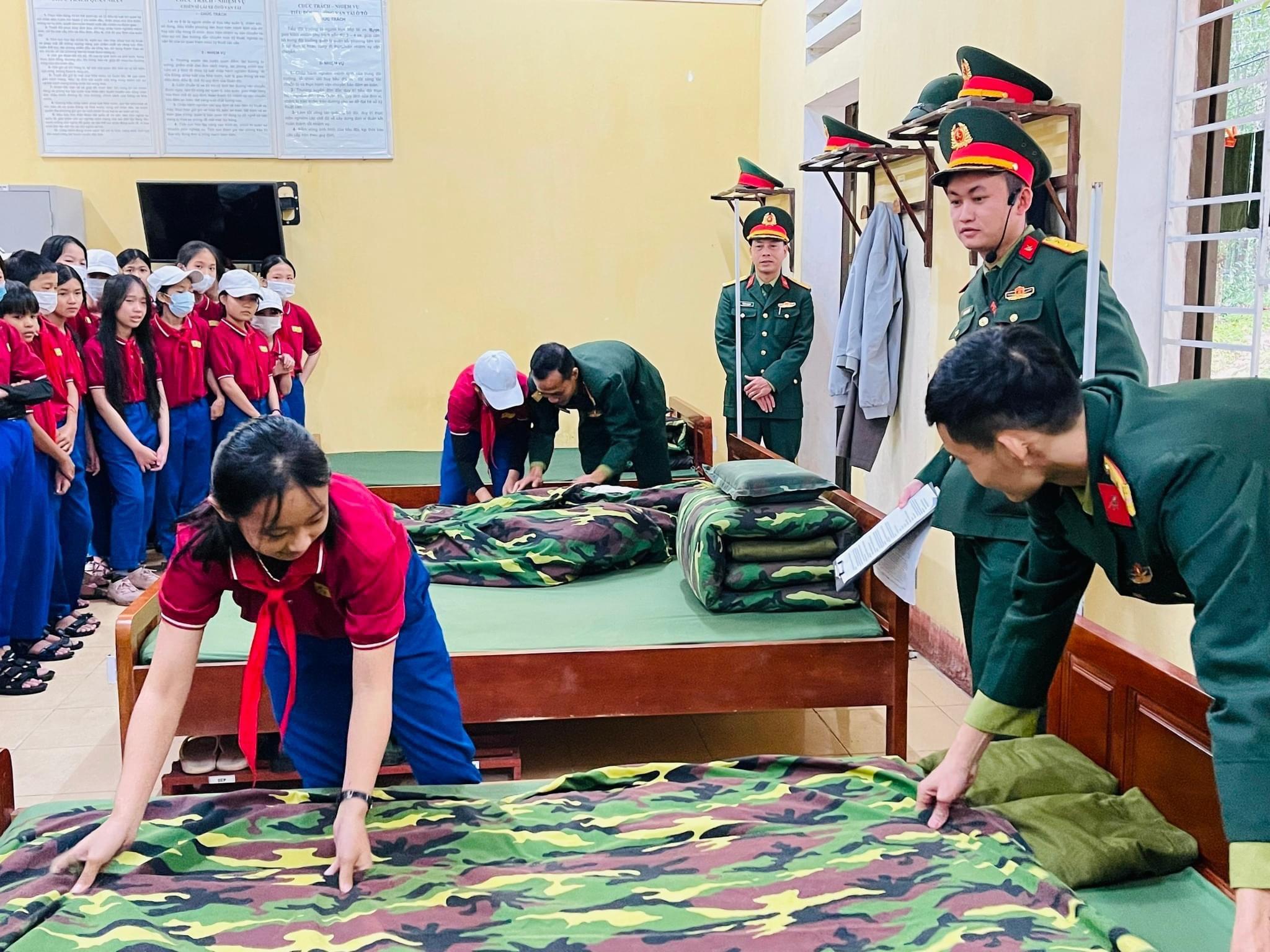 Các em học sinh tham quan trải nghiệm và thực hành gấp chăn, màn cùng cán bộ chiến sỹ Tiểu đoàn 410