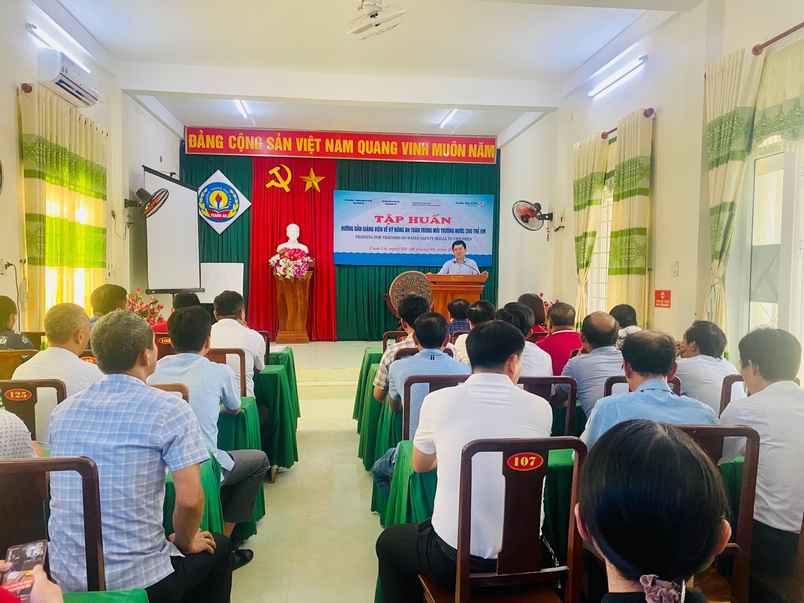 Ngày 23/3/2023, Phòng Giáo dục và Đào tạo huyện Cam Lộ phối hợp với Sở Giáo dục và Đào tạo, Sở Lao động Thương binh và Xã hội tỉnh tổ chức tập huấn hướng dẫn giảng viên về kỹ năng an toàn trong môi trường nước cho trẻ em cho cán bộ, giáo viên làm công tác phụ trách đoàn, đội các trường học trên địa bàn huyện.