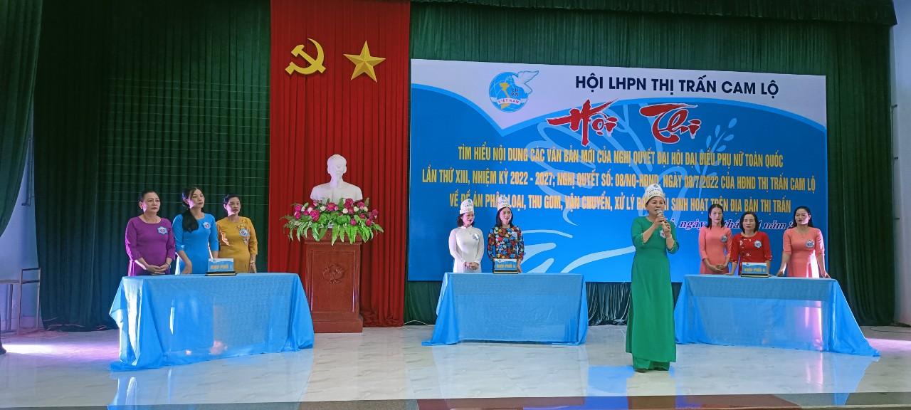 Hội Liên hiệp phụ nữ thị trấn Cam Lộ vừa tổ chức hội thi tìm hiểu nội dung các văn bản mới của Nghị quyết Đại hội đại biểu phụ nữ toàn quốc lần thứ XIII, nhiệm kỳ 2022-2027; Nghị quyết số 08/NQ-HĐND, ngày 8/7/2021 của HĐND thị trấn Cam Lộ về đề án phân loại, thu gom, vận chuyển, xử lý rác thải sinh hoạt trên địa bàn thị trấn.