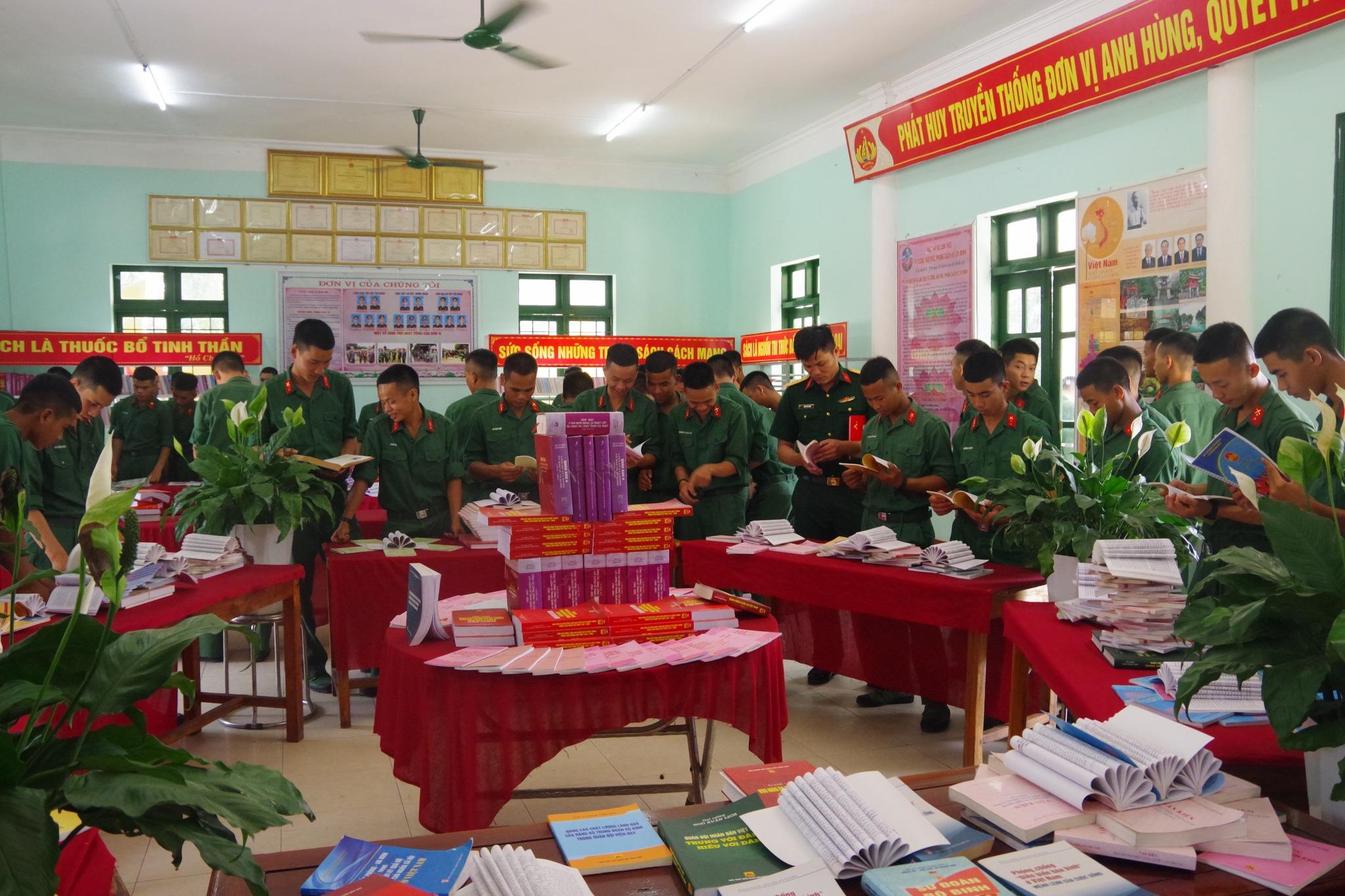 Cán bộ, chiến sĩ đơn vị đọc sách tại phòng trung bày