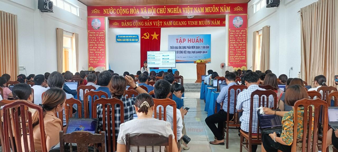 Ngày 15/5/2023, Phòng Giáo dục và Đào tạo huyện Cam Lộ phối hợp với Trung tâm Tin học tỉnh tổ chức tập huấn ứng dụng phần mềm quản lý văn bản và hồ sơ công việc cho đội ngũ cán bộ lãnh đạo và cán bộ phụ trách công tác văn phòng, công nghệ thông tin các trường học trực thuộc trên địa bàn huyện.
