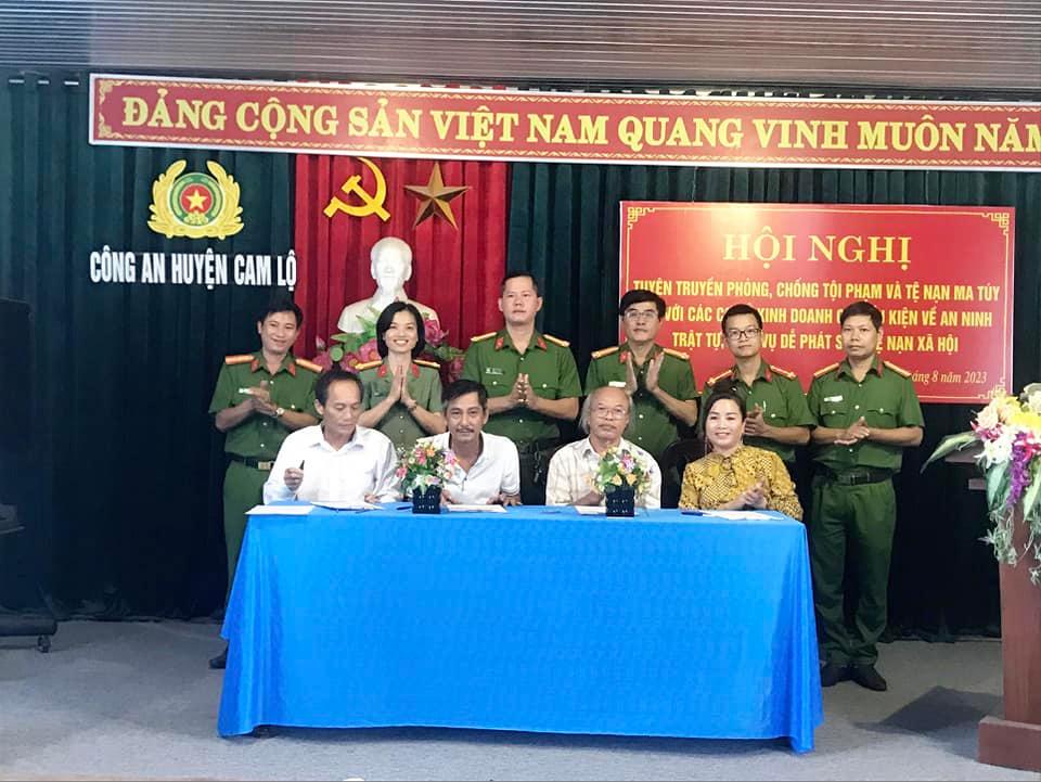 Cũng tại hội nghị, Công an huyện Cam Lộ tổ chức cho các chủ cơ sở kinh doanh có điều kiện về ANTT trên địa bàn ký cam kết đảm bảo phối hợp, tuân thủ nghiêm chỉnh các quy định của pháp luật về công tác phòng, chống tội phạm và tệ nạn ma tuý trong quá trình hoạt động.