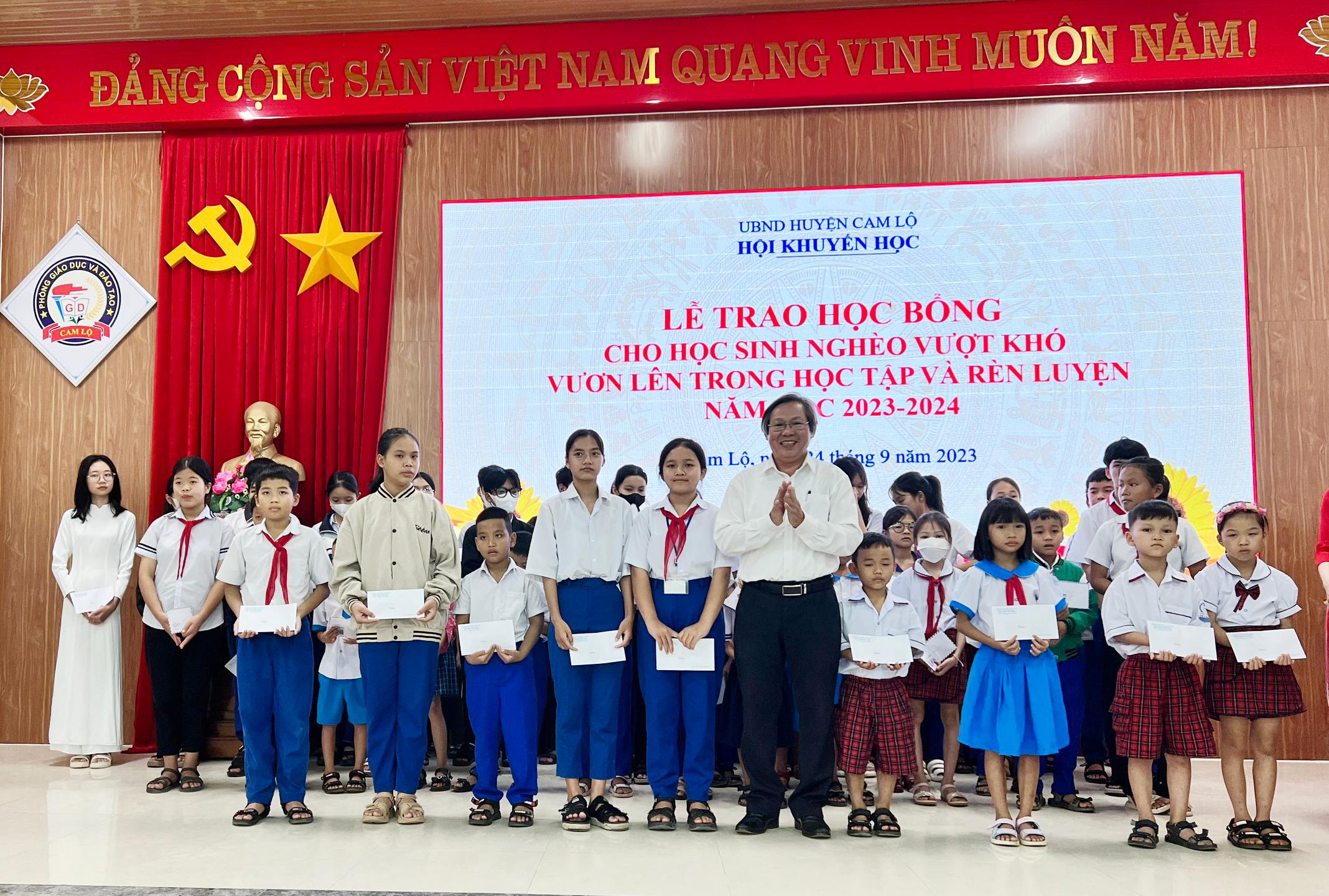 Theo đó, Hội Khuyến học huyện Cam Lộ đã trao tặng 86 suất học bổng cho 86 em từ cấp Tiểu học đến cấp THPT có hoàn cảnh khó khăn trên địa bàn huyện, mỗi suất trị giá 500 ngàn đồng. Toàn bộ kinh phí được trích từ quỹ khuyến học huyện cùng sự chung tay hỗ trợ của các tổ chức và cá nhân hảo tâm.