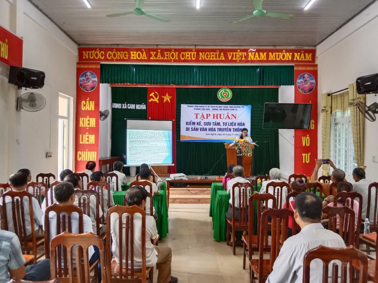 Ngày 6/11/2023, Trung tâm Quản lý di tích và Bảo tàng tỉnh Quảng Trị phối hợp với Phòng Văn hóa – Thông tin huyện Cam Lộ tổ chức tập huấn kiểm kê, sưu tầm, tư liệu hóa di sản văn hóa truyền thống cho đội ngũ công chức văn hóa, trưởng thôn, nghệ nhân, người thực hành, giữ gìn, bảo tồn di sản văn hóa truyền thống, người có uy tín, am hiểu về di sản văn hóa truyền thống trên địa bàn hai xã Cam Chính và Cam Nghĩa.