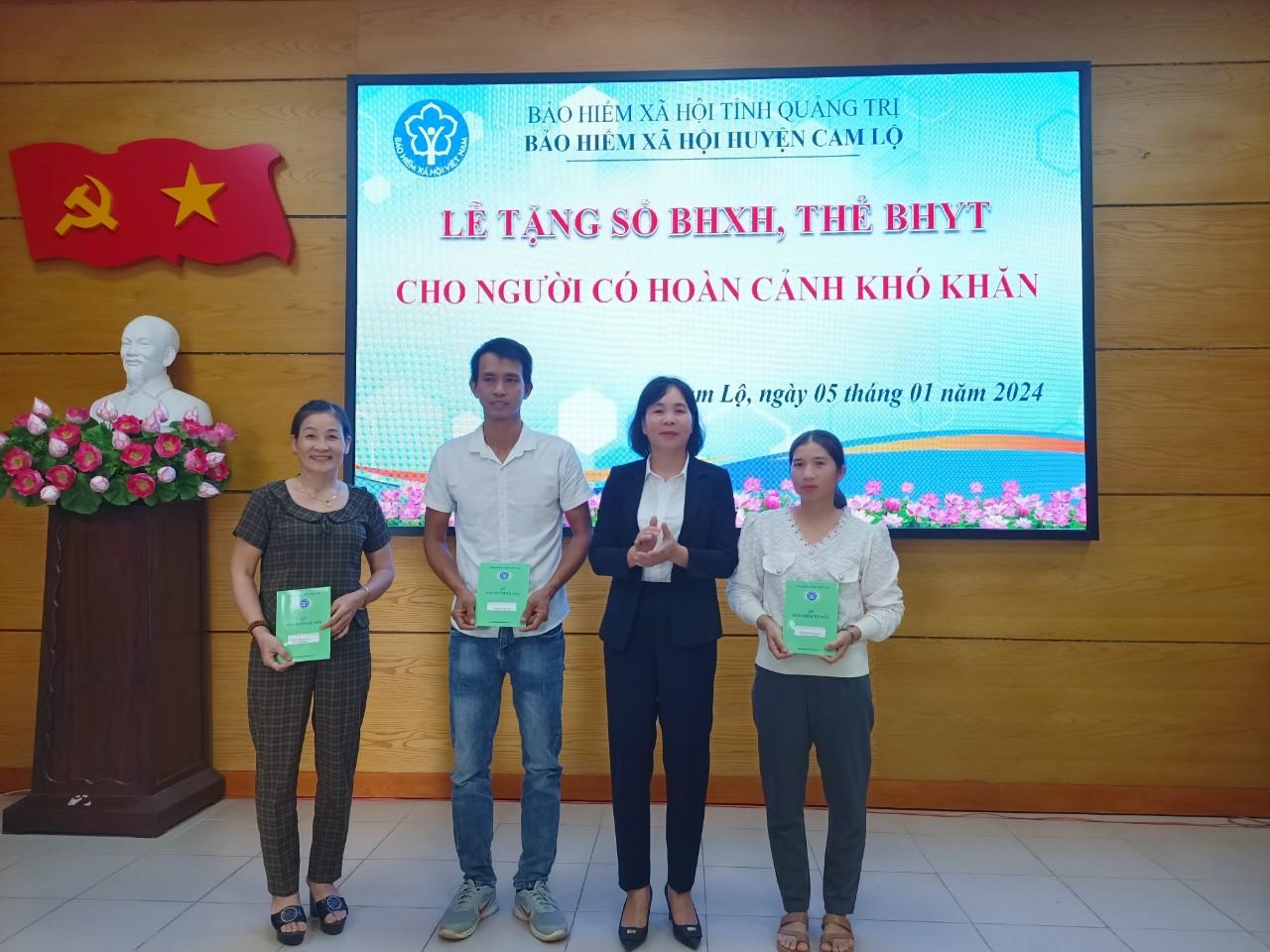 Bảo hiểm xã hội huyện Cam Lộ đã tổ chức chương trình trao tặng sổ BHXH và thẻ BHYT cho người có hoàn cảnh khó khăn trên địa bàn huyện. Đến dự có đồng chí Nguyễn Thị Thanh Hương, UVTV, Trưởng Ban Dân vận Huyện ủy, Chủ tịch UBMT huyện.