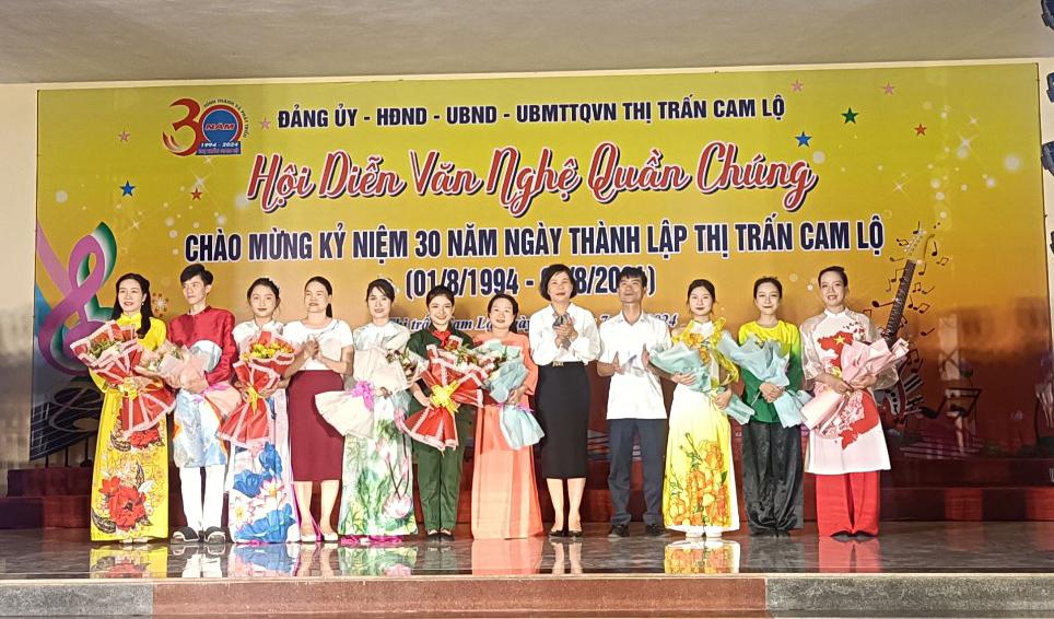 Đồng chí Nguyễn Thị Thanh Hương, UVBTV Huyện ủy, Trưởng Ban Dân vận, Chủ tịch UBMT huyện và lãnh đạo thị trấn Cam Lộ tặng hoa cho các đội tham gia hội diễn