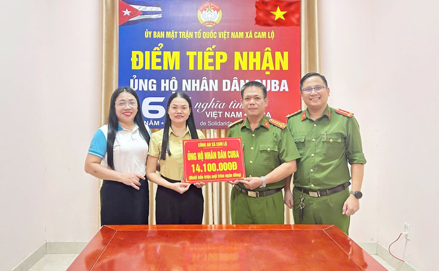 Dịp này, lực lượng Công an xã Cam Lộ đã chung tay hưởng ứng lời kêu gọi của Trung ương Hội Chữ thập đỏ Việt Nam tại lễ phát động cấp quốc gia về chương trình vận động ủng hộ Nhân dân Cuba với chủ đề “65 năm nghĩa tình Việt Nam – Cuba” với số tiền hơn 14 triệu đồng.