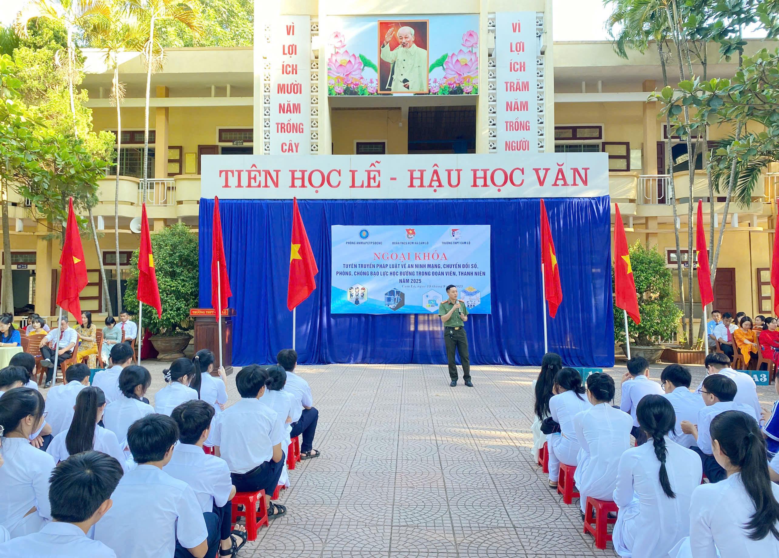 Sáng 15/09/2025 tại Trường THPT Cam Lộ, hơn 1000 học sinh cùng toàn thể cán bộ, giáo viên đã tham gia buổi chuyên đề “Tuyên truyền pháp luật về an ninh mạng, chuyển đổi số, phòng chống bạo lực học đường trong đoàn viên, thanh niên”. Chương trình do Trường THPT Cam Lộ phối hợp với Phòng PA05 Công an tỉnh Quảng Trị, Công an xã Cam Lộ, Đoàn TNCS Hồ Chí Minh xã Cam Lộ và Trung tâm phục vụ hành chính công xã Cam Lộ tổ chức.