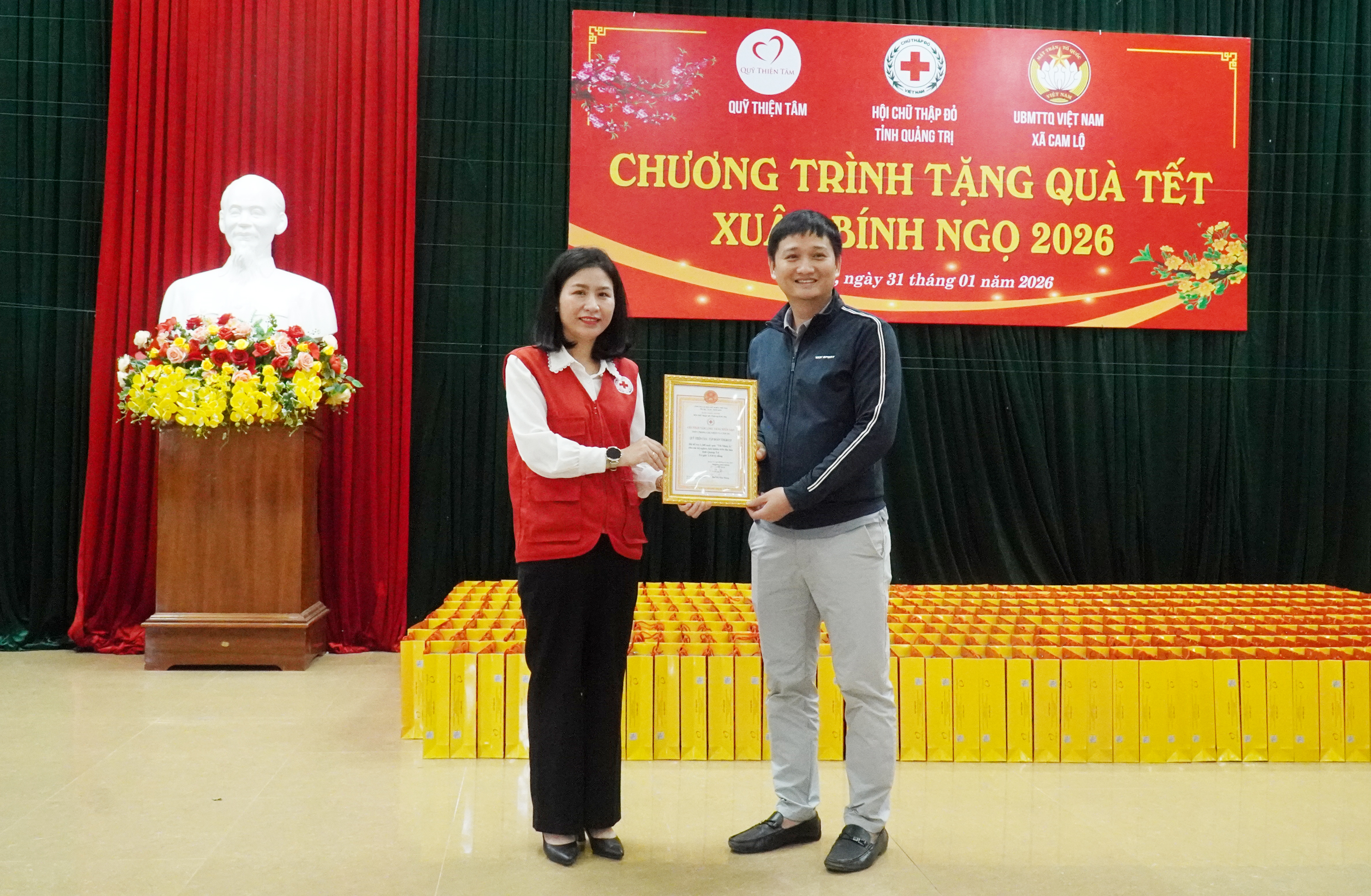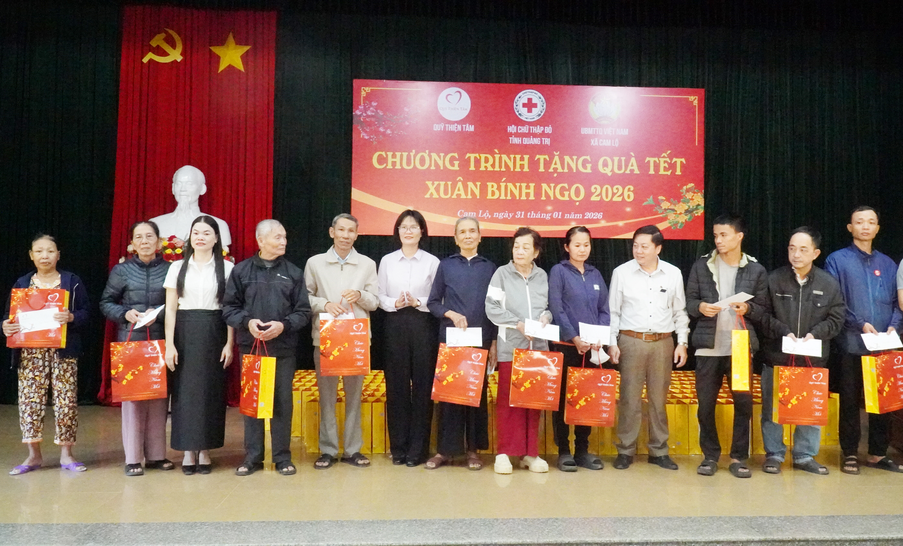 Nhân dịp đón Tết Nguyên đán Bính Ngọ 2026, sáng 31/1, Hội Chữ thập đỏ tỉnh phối hợp với Quỹ Thiện Tâm (Tập đoàn Vingroup) và Ủy ban MTTQ Việt Nam xã Cam Lộ tổ chức chương trình trao quà Tết cho các hộ gia đình có hoàn cảnh khó khăn trên địa bàn xã.