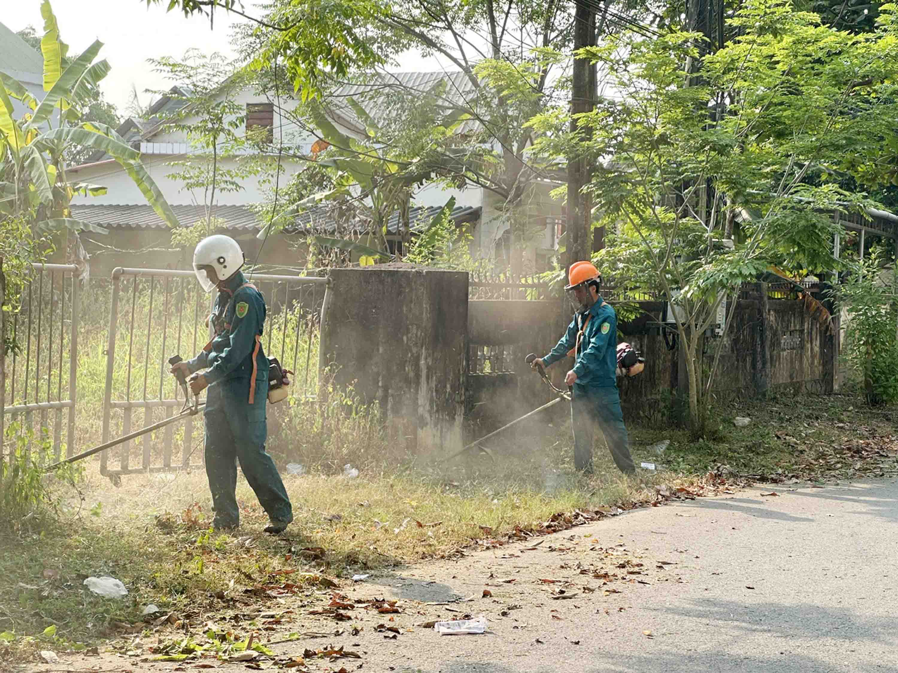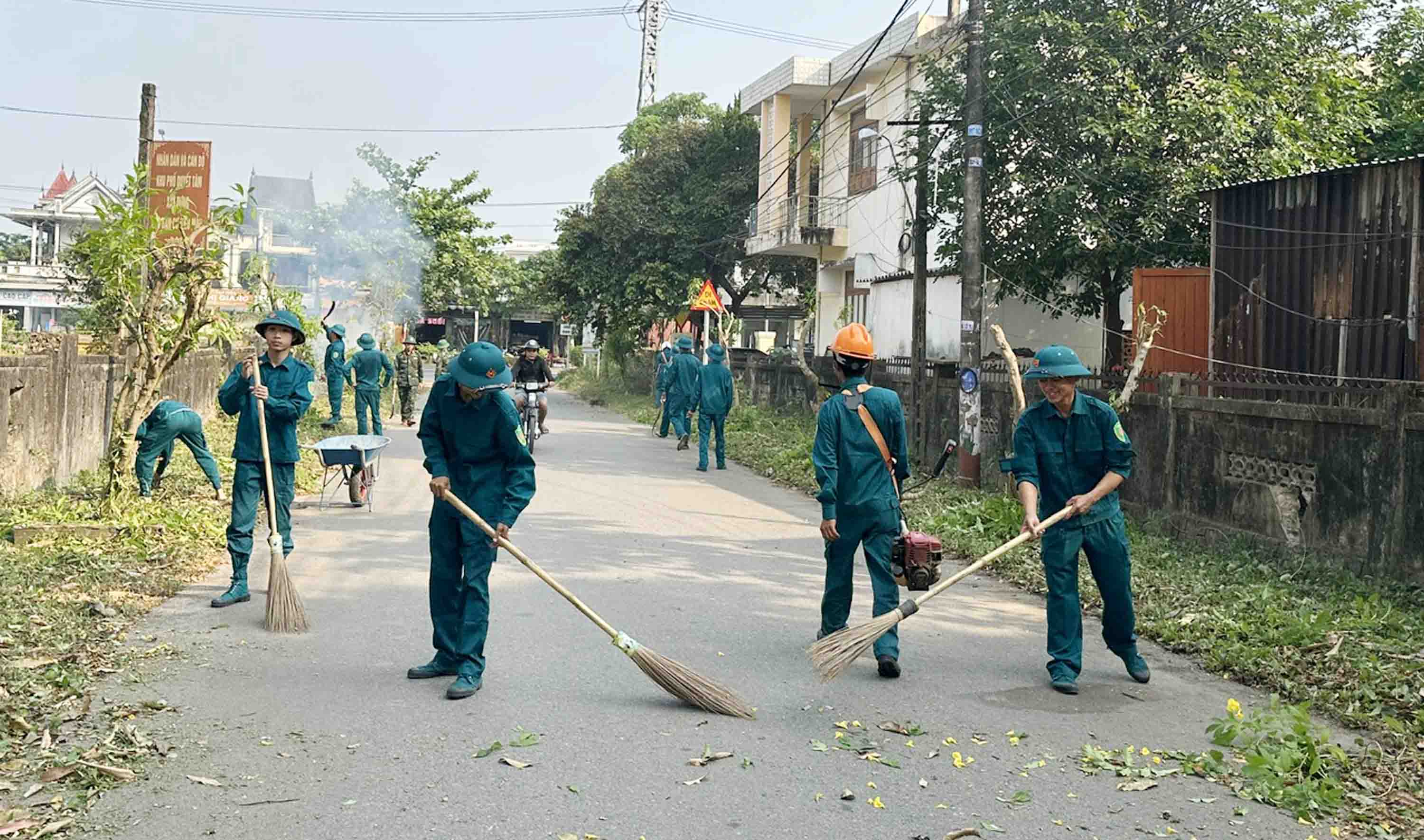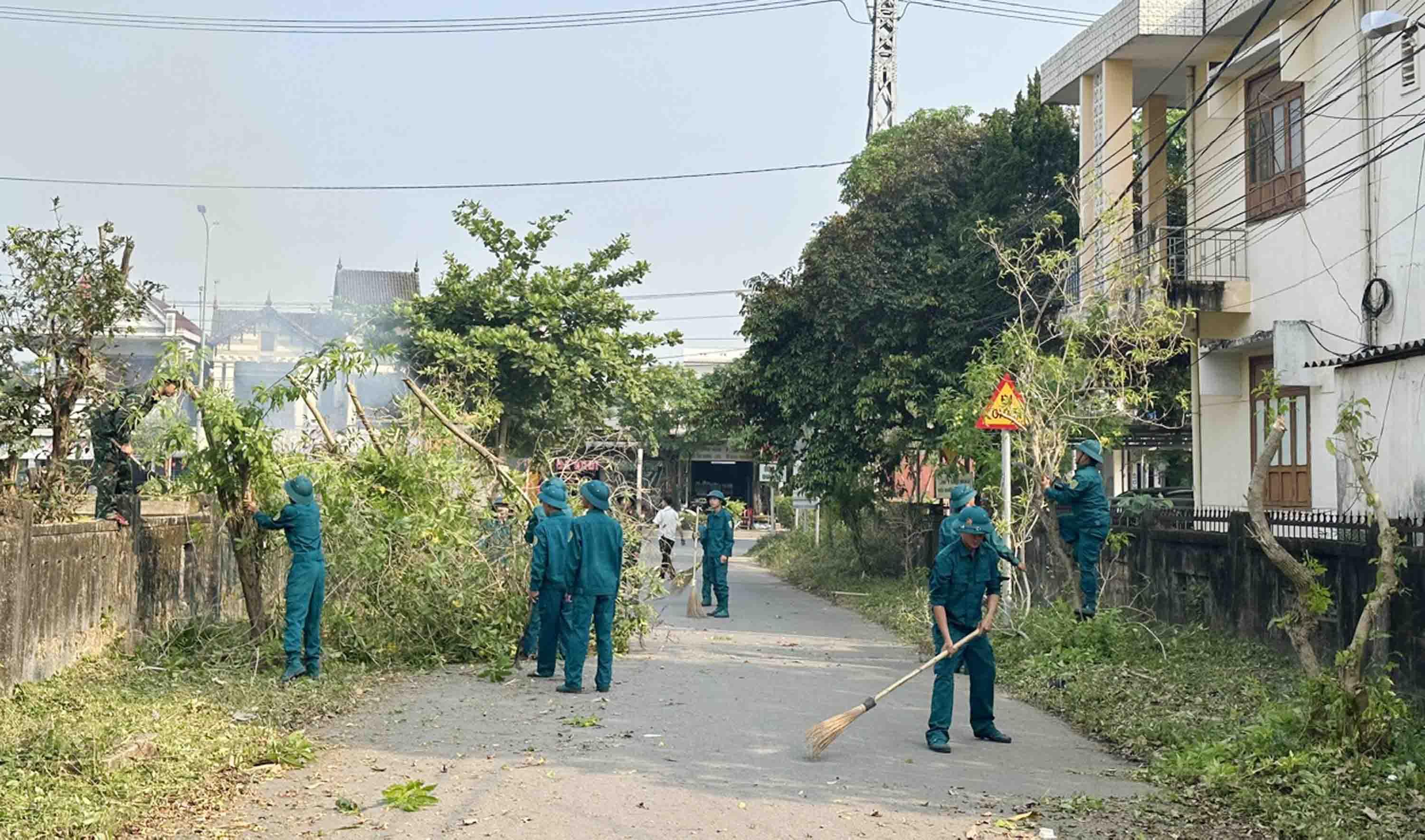 Lực lượng dân quân đã tham gia dọn vệ sinh môi trường ở thôn 1