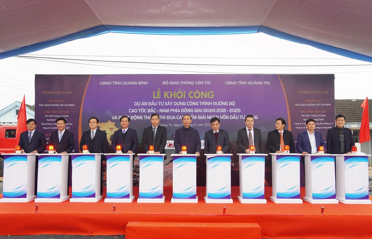 Lãnh đạo Bộ Giao thông vận tải và lãnh đạo hai tỉnh Quảng Bình, Quảng Trị bấm nút khởi công dự án cao tốc Vạn Ninh – Cam Lộ