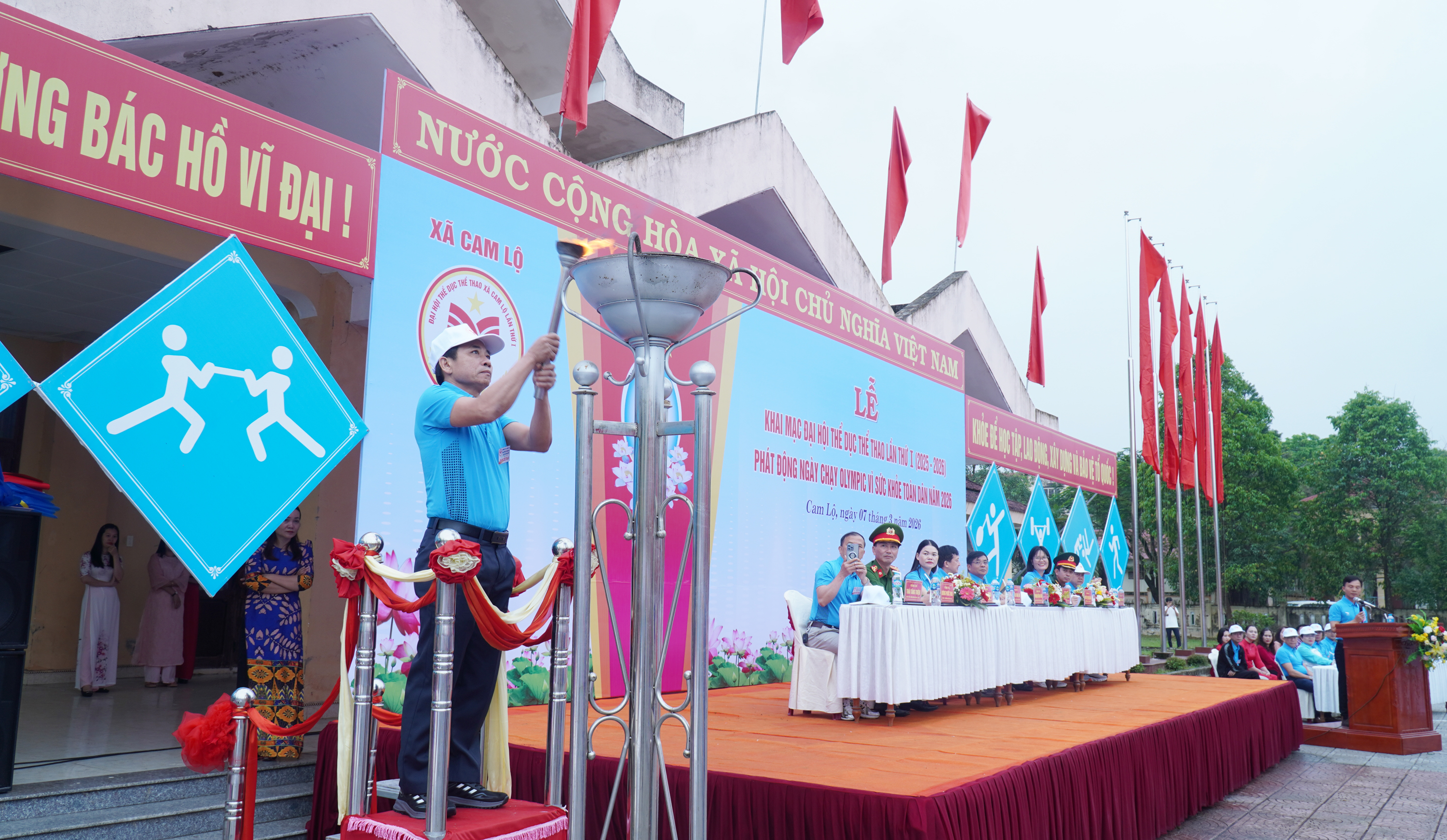 Tại lễ khai mạc, nghi thức rước và thắp đuốc truyền thống được tổ chức trang nghiêm. Đồng chí Nguyễn Văn Ân, Phó Bí thư Đảng ủy, Chủ tịch UBND xã đã thắp ngọn lửa truyền thống, chính thức khai mạc Đại hội Thể dục thể thao xã Cam Lộ lần thứ I.