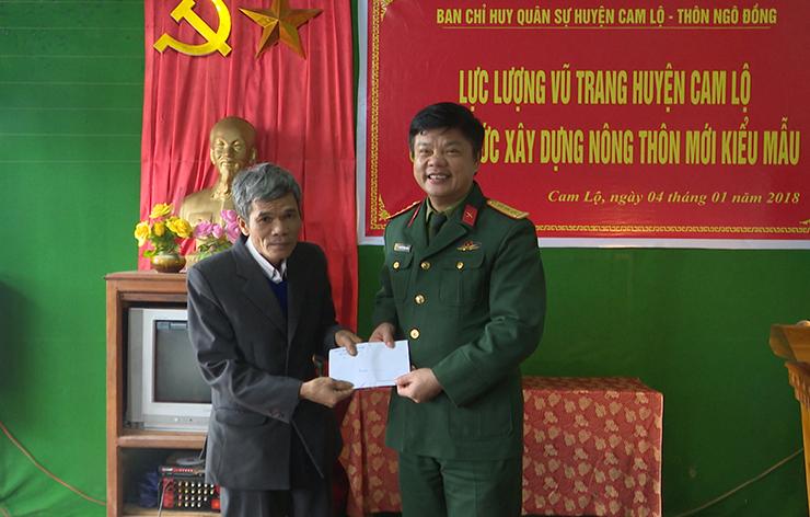 Lực lượng vũ trang huyện Cam Lộ trao tiền hỗ trợ xây dựng NTM kiểu mẫu cho thôn Ngô Đồng, xã Cam Thành