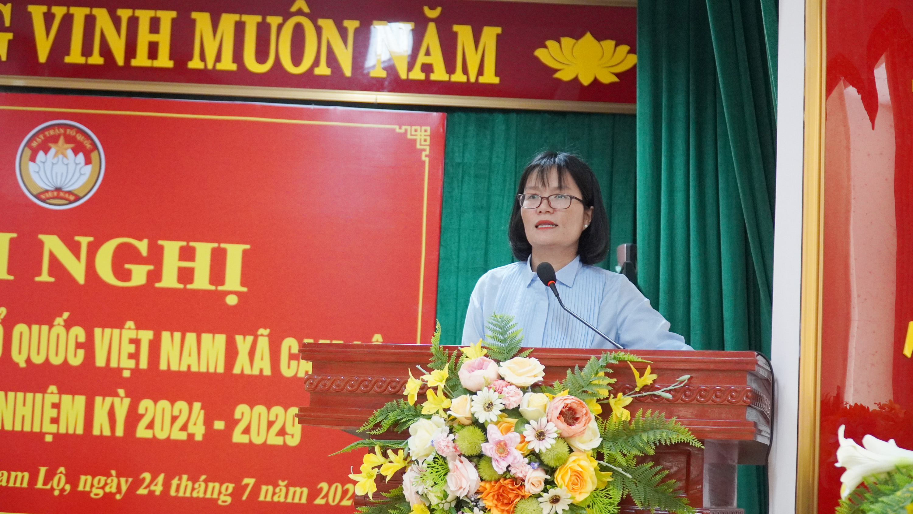 Phát biểu chỉ đạo tại hội nghị, Phó Bí thư Thường trực Đảng ủy Nguyễn Thị Hoàng Oanh nhấn mạnh vai trò của Mặt trận Tổ quốc Việt Nam là Trung tâm khối đại đoàn kết toàn dân tộc, là nơi tập hợp, thống nhất ý chí và hành động của các tầng lớp Nhân dân. Đồng chí đề nghị các thành viên Ủy ban MTTQ Việt Nam xã Cam Lộ tiếp tục phát huy tinh thần trách nhiệm, chủ động tuyên truyền, vận động Nhân dân thực hiện hiệu quả các chủ trương của Đảng, chính sách, pháp luật của Nhà nước, phát huy vai trò nòng cốt của Mặt trận trong xây dựng khối đại đoàn kết toàn dân; tập trung tuyên truyền, vận động và nắm bắt tình hình, tâm tư, nguyện vọng của đoàn viên, hội viên và Nhân dân sau sáp nhập chính quyền địa phương 2 cấp; tăng cường hoạt động giám sát, phản biện xã hội; tham gia tích cực vào công tác phòng, chống tham nhũng, lãng phí, xây dựng Đảng, chính quyền trong sạch, vững mạnh.