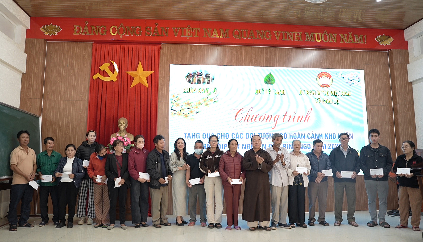 Nhân dịp Tết nguyên đán Bính Ngọ 2026, chiều 11/2, Chùa Cam Lộ, Quỹ Lá xanh (tỉnh Hưng Yên) phối hợp với Ủy ban MTTQ Việt Nam xã Cam Lộ tổ chức trao quà Tết cho người nghèo và người có hoàn cảnh khó khăn trên địa bàn xã Cam Lộ. Đến dự có đồng chí Hoàng Thị Thu Nhạn, UVBTV, Phó Chủ tịch HĐND xã; đồng chí Dương Thị Thương, UVBTV, Chủ tịch Ủy ban MTTQ Việt Nam xã; Đại đức Thích Viên Thành, Trụ trì Chùa Cam Lộ.