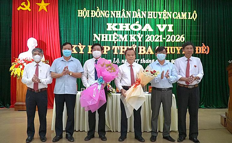 Phó Chủ tịch Thường trực HĐND tỉnh Lê Quang Chiến và lãnh đạo huyện tặng hoa chúc mừng Chủ tịch HĐND huyện Cam Lộ Nguyễn Ký Ngọc và nguyên Chủ tịch HĐND huyện Cam Lộ Ngô Quang Chiến nhiệm kỳ 2021-2026