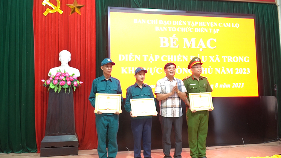 Dịp này, UBND huyện đã tặng giấy khen cho 3 tập thể và 5 cá nhân có thành tích xuất sắc trong tham gia diễn tập chiến đấu xã trong khu vực phòng thủ năm 2023.