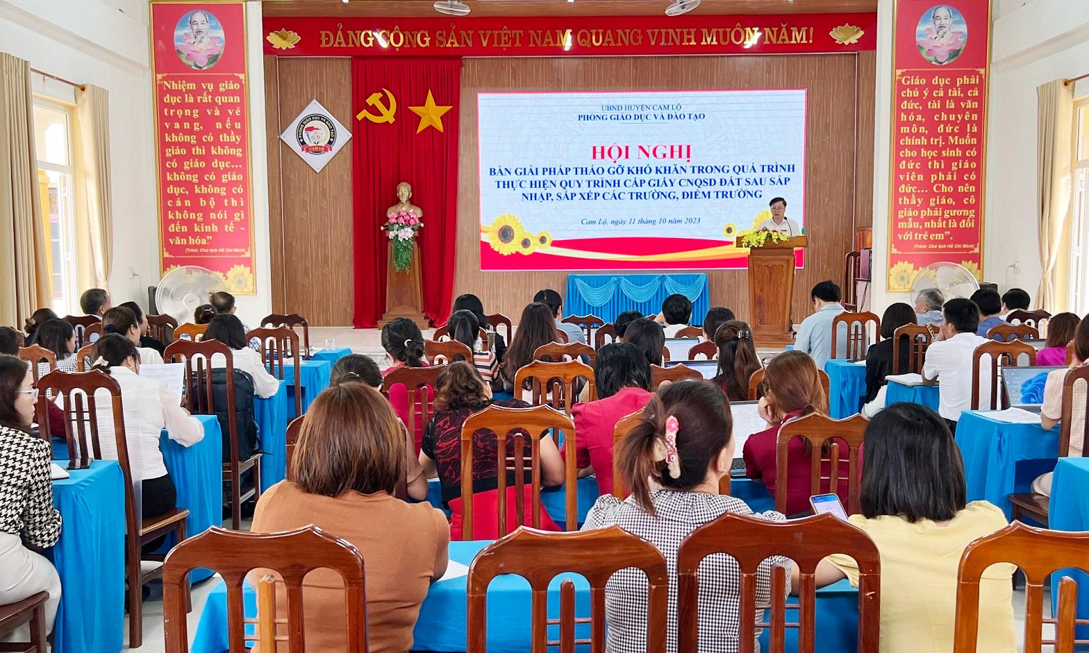 Phòng Giáo dục và Đào tạo vừa phối hợp với các phòng: Tài nguyên và Môi trường, Tài chính-Kế hoạch, Kinh tế-Hạ tầng và Văn phòng Đăng ký quyền sử dụng đất đai huyện Cam Lộ tổ chức hội nghị bàn giải pháp tháo gỡ khó khăn trong quá trình thực hiện quy trình cấp giấy CNQSD đất sau sáp nhập, sắp xếp các trường, điểm trường trên địa bàn.